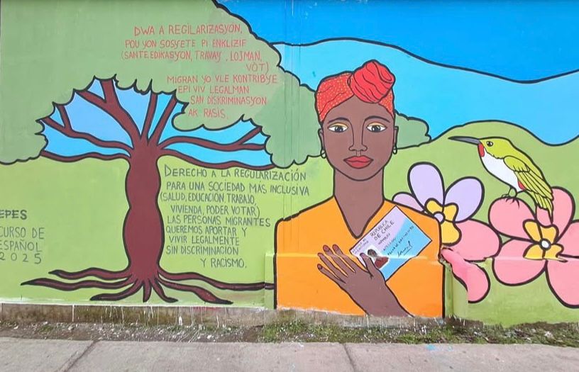 Como parte del proceso formativo, las participantes protagonizaron una jornada colectiva de pintura de un mural frente a la sede de EPES en El Bosque. El mensaje central fue el derecho a la regularización, una demanda urgente definida por las propias mujeres, incorporando elementos simbólicos de Haití, como su flora y fauna.